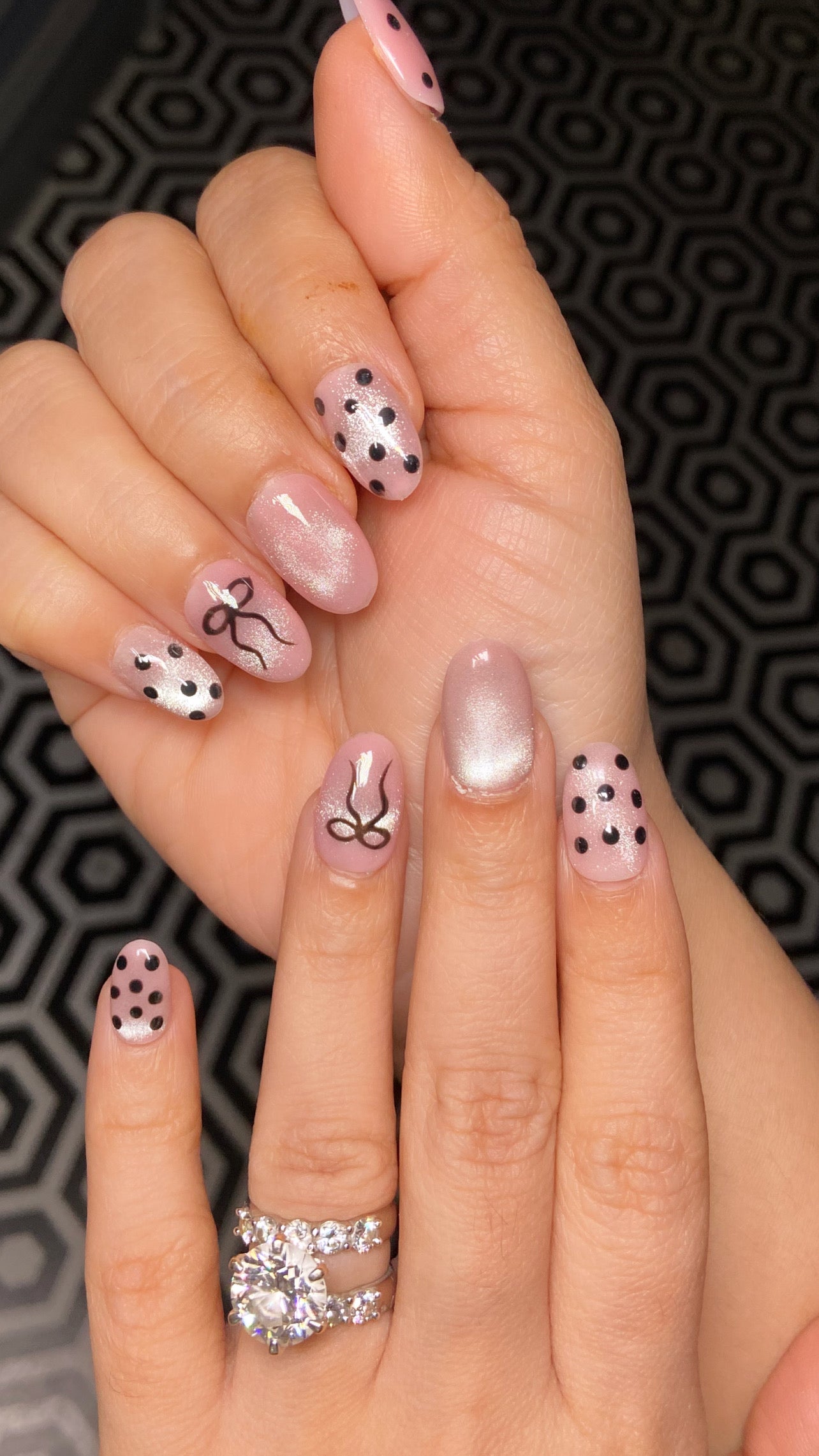 Bowrose Oval nails from The Nail Factory feature a soft rose-toned base with delicate bow-inspired detailing on a smooth oval shape. The glossy finish enhances the fine accents, while the rounded tip offers a comfortable, elegant look for everyday wear. Charming and refined, this design pairs beautifully with both casual and dressy styles.