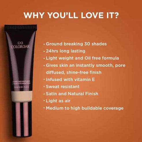 The secret to a photo-perfect and pore-diffused face is revealed! It’s 24 Hrs Weightless Liquid Foundation. A first-of-its-kind hydrating long-wear foundation that delivers it all, with comfortable medium to full buildable coverage, 24hrs staying power, and a natural finish perfect for normal to dry skin. With an inclusive ground-breaking range of 30 shades, this Colorbar Foundation has been created to suit your undertone and even out your complexion. Light as air, this weightless liquid foundation locks in moisture and hydration to give you instantly flawless skin, shine-free coverage, and a luminous glow. This oil-free and radiant satin liquid foundation come with a bouncy texture along with high protection factor. It’s your main hero to blur and perfect the skin, leaving the complexion even, protected, and moisturized for hours. After using this liquid foundation, your complexion will appear flawless and even and the pores tightened. Also, it stays intact on your skin even on sweaty or rainy days due to its sweat and humidity-resistant formula.