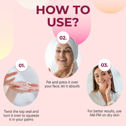 Remove the top seal, gently twist the cap to the right, turn over and squeeze dollops of anti-ageing magic. Use day and night on clean, dry skin. Apply to palms, then pat and press over your face; letting it absorb. Twist again to close.
