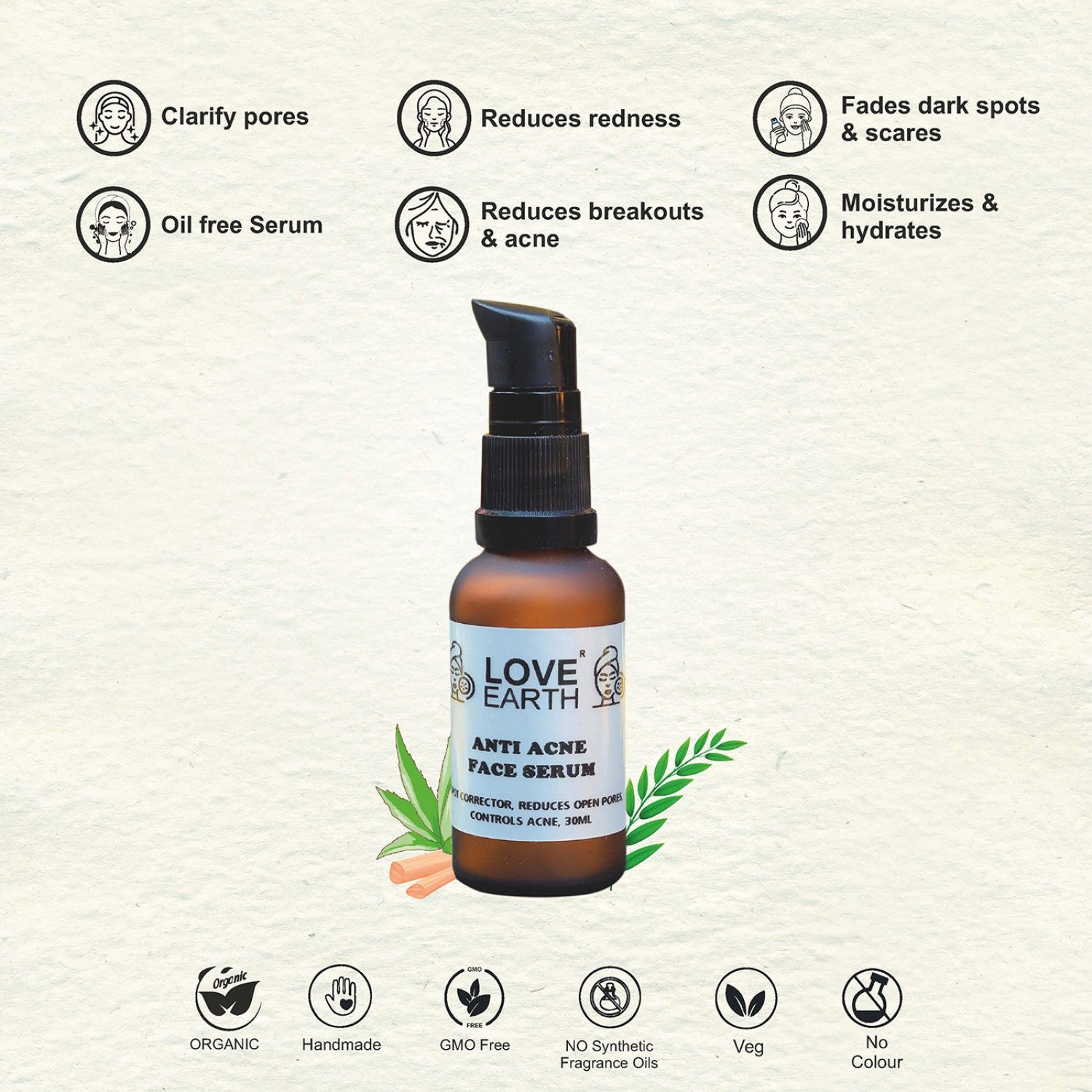 - The Anti Acne Serum from Love Earth minimizes and corrects the open pores. It furiously reserves the collagen and increases its production in the skin cells to give it a more youthful glow.