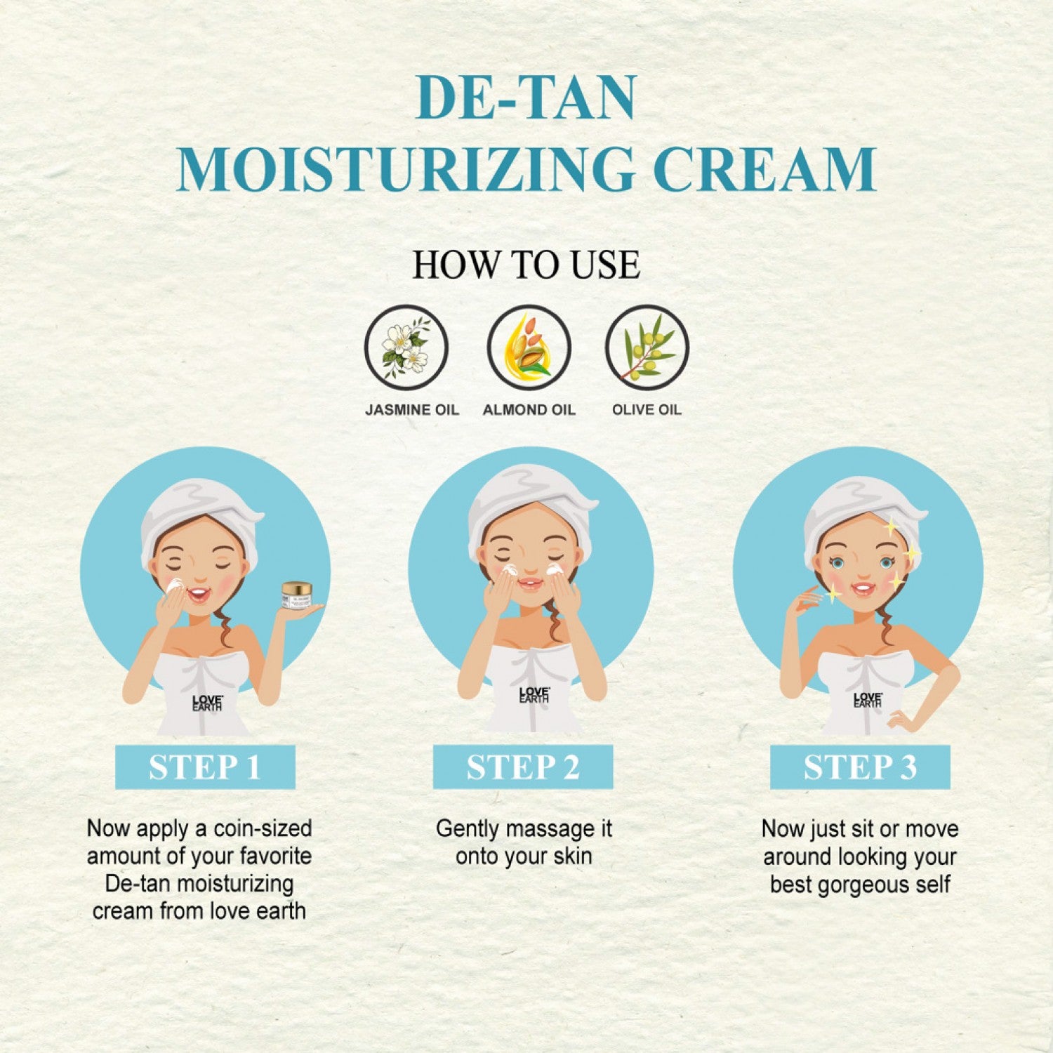 - Now apply a coin-sized amount of your favorite DE-TAN MOISTURIZING CREAM from Love earth.