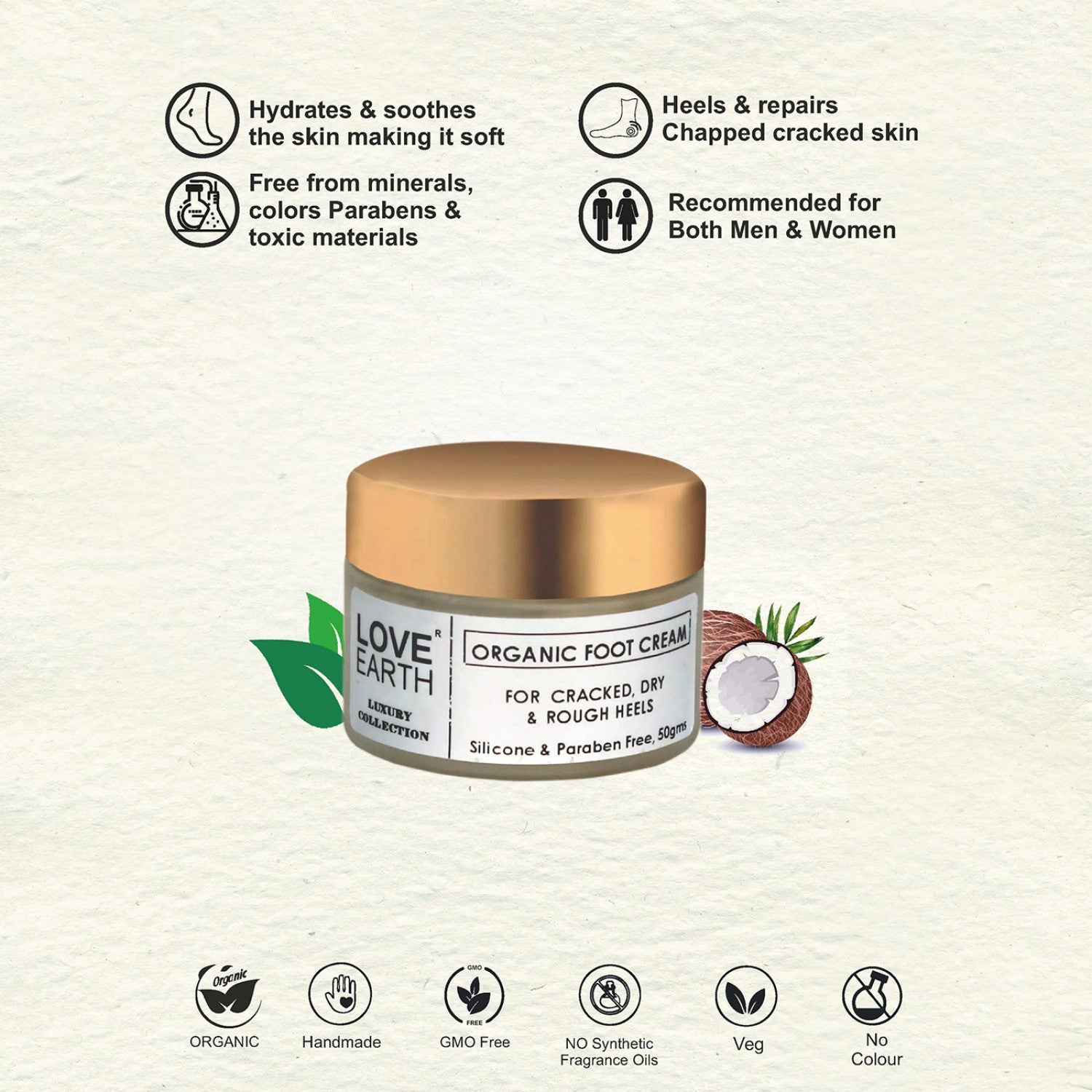 LOVE EARTH’S Organic Foot Cream heals and soothes affected areas, by reducing cracks and roughness, and sealing moisture in the skin. The essential Organic herbs present in this organic foot cream possess amazing healing properties that help relieve discomfort and prevent further infection.