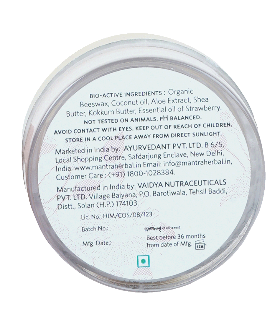 A rich lip balm infused with the goodness of Aloe & Strawberries that exfoliates dead skin cells while the organic natural beeswax & Shea butter luxuriously moisturizes the lips. Kokum butter is rich in Vitamin E, making it extremely effective in treating chapped lips.