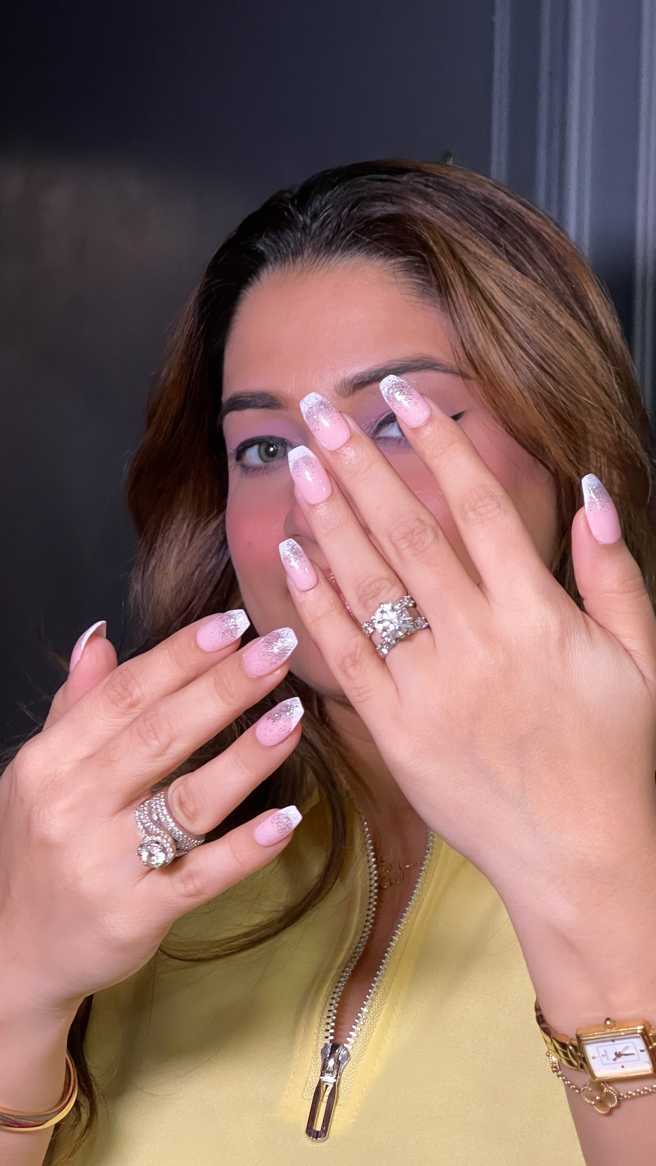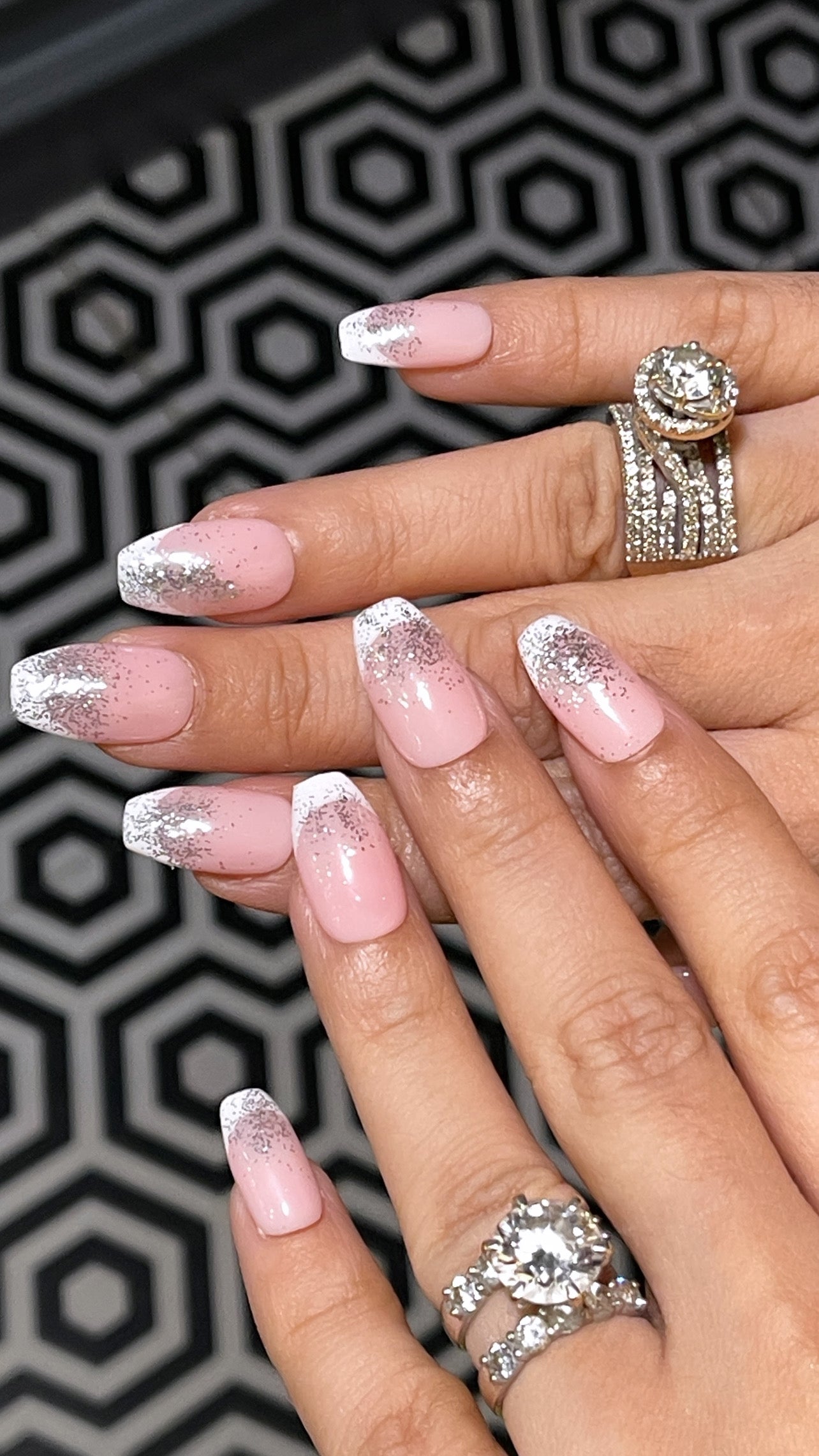 Twinkle French Ballerina nails from The Nail Factory combine a classic French tip look with a subtle shimmer on a sleek ballerina shape. The tapered tip adds elegance, while the glossy finish enhances the delicate detailing. Graceful and versatile, this design suits both everyday styles and special occasions.