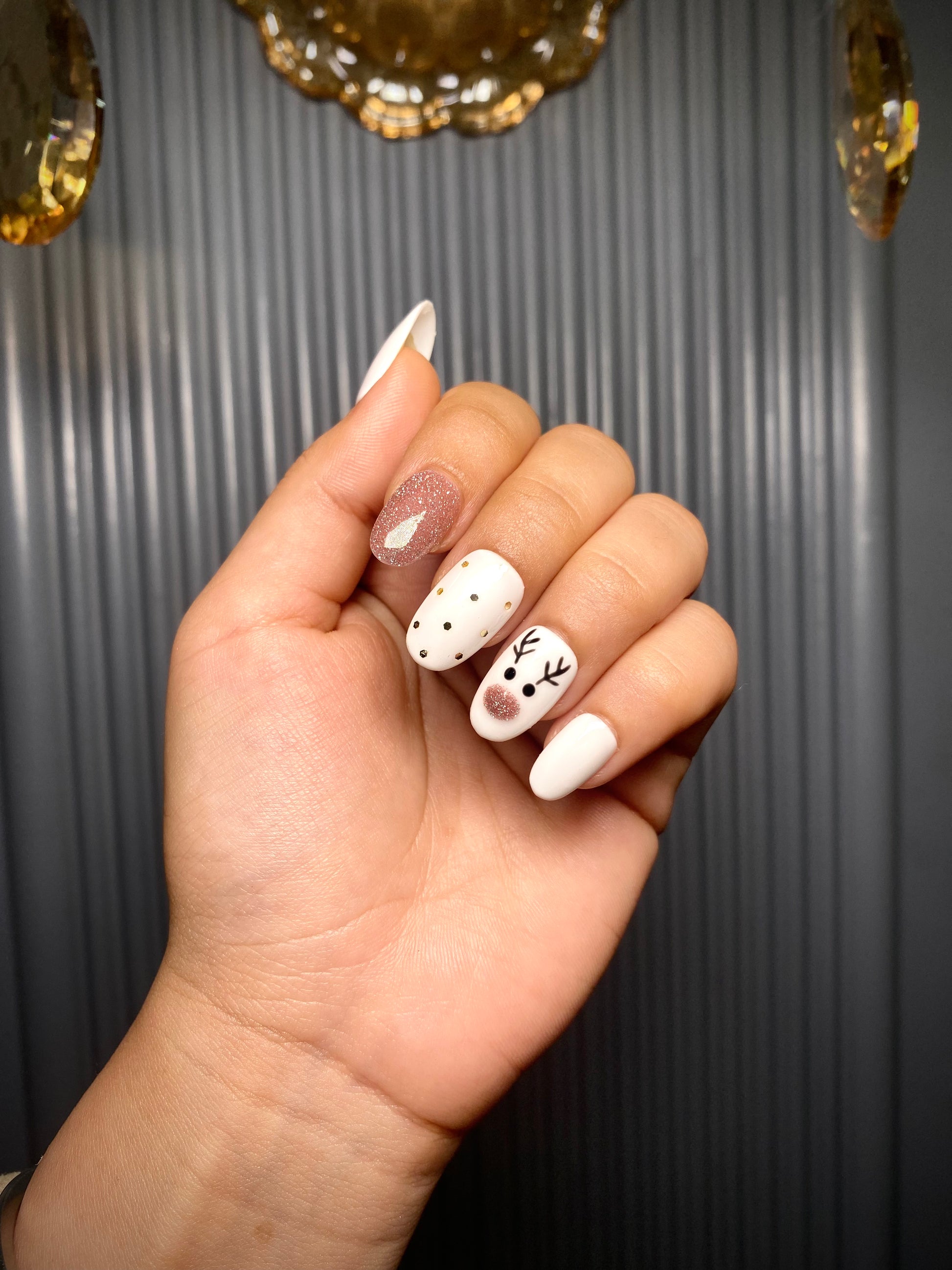 Elegant with a festive charm, the White Shimmery Deer Press-On Nails feature a soft white base with a delicate shimmer and graceful deer motifs that add a whimsical, winter-inspired touch. The subtle sparkle enhances the design while keeping it refined and classy, making these nails perfect for celebrations, holidays, or cozy seasonal looks. Designed for a natural, flattering fit, they deliver a salon-quality finish in minutes. Crafted from premium, long-lasting material, these press-on nails are easy to apply, comfortable to wear, and reusable for effortless beauty anytime.